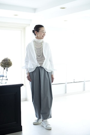 デザイナー・小林一美さんが手がける「ル・ピボット」は、確かな素材選びと、大人が着てバランスよく、かつ美しく決まるシルエットが魅力。今季登場したシャツは、大きすぎず、タイトすぎずの絶妙なサイジング。経糸に120番、緯糸に100番と、番手の違う糸を使用することによって、ほどよい肉感に仕上がったコットン地を使用しています。