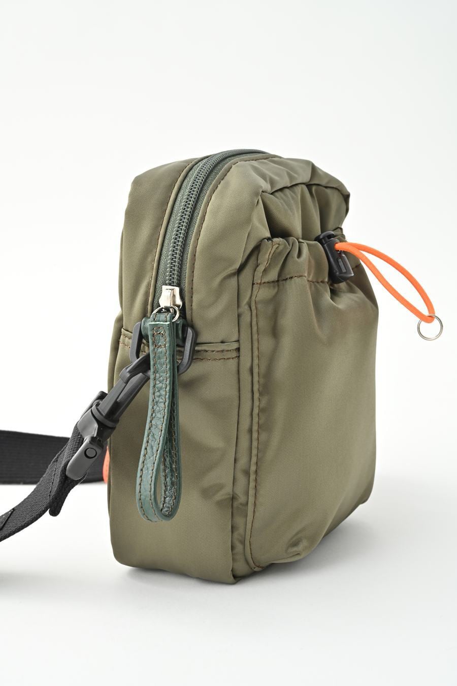 「ポケットのドローストリングコードやショルダーストラップに鮮やかなオレンジを効かせた、“MA-1”ジャケットを思わせるカラーリングが魅力です」と丸山さん。ファスナーの引き手には牛革を使用して、カジュアルすぎない印象に仕上げられています。