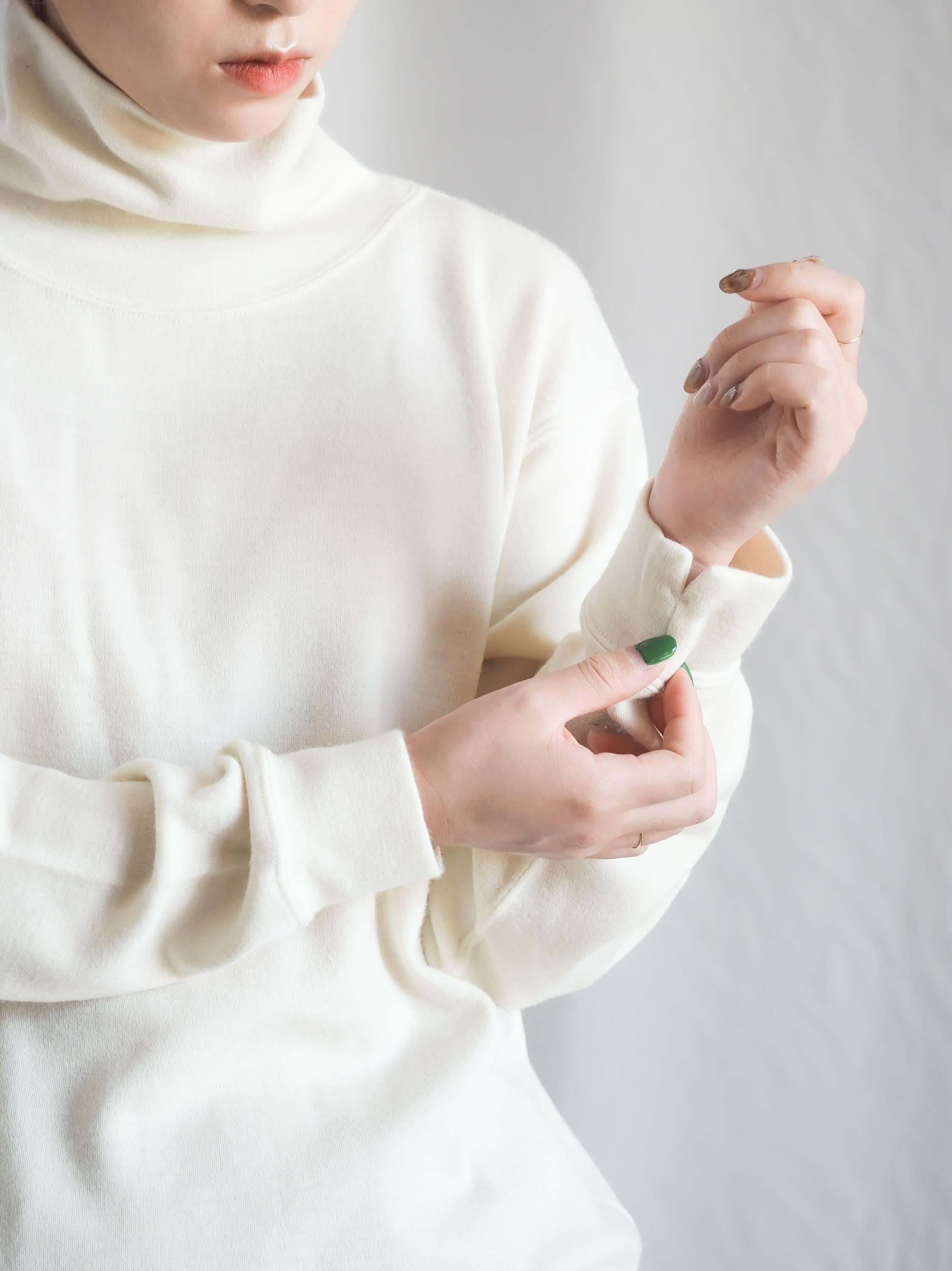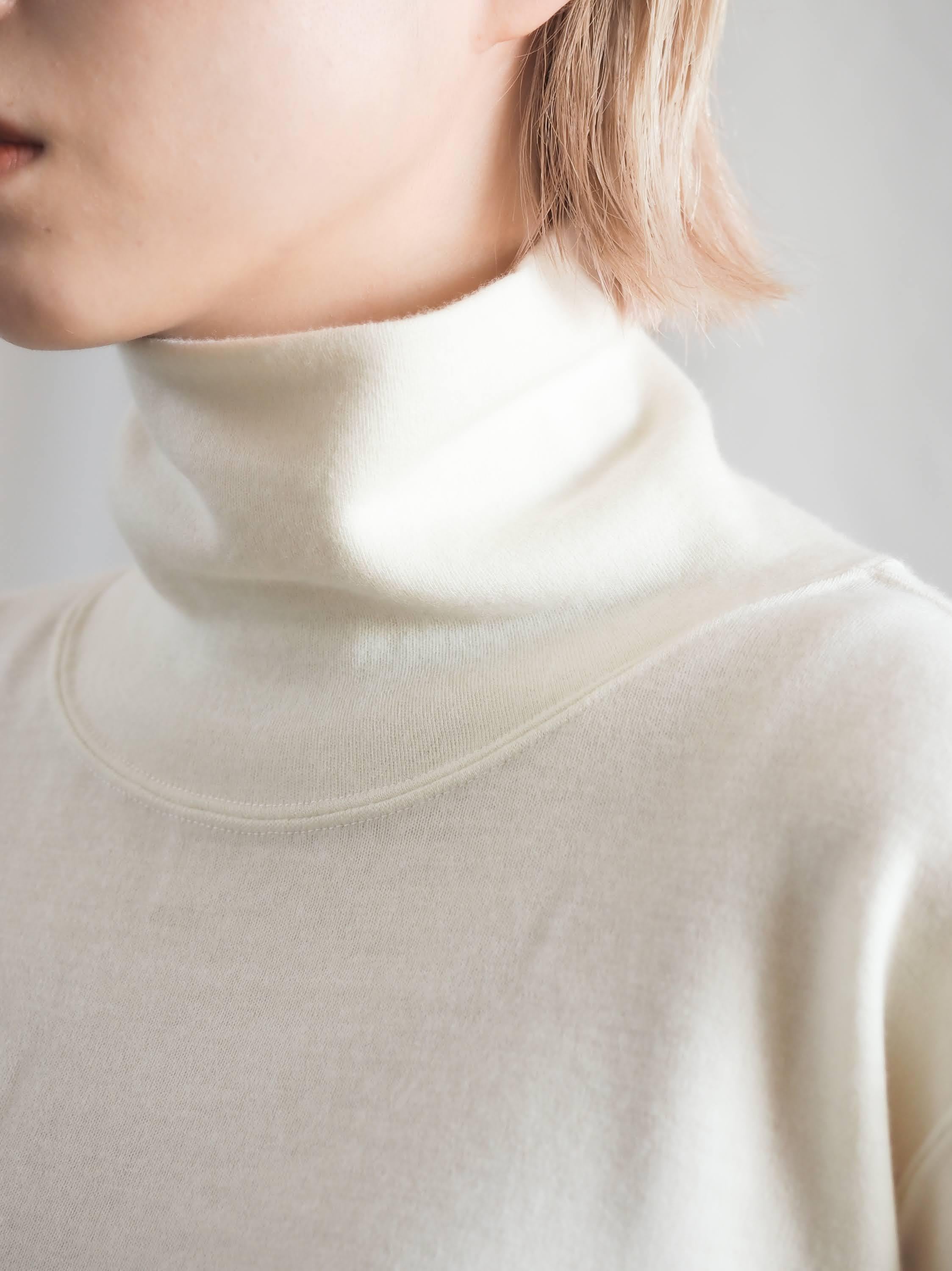 首までやさしく包み込む“とっくり”型のセーターは抜群のあたたかさ。“無添加ウール”ならではの豊かなふくらみで空気を含み、抜群の保温性と軽さを実現。直接肌にいてもチクチクしない唯一無二の「糸と色」のウールカットソー。