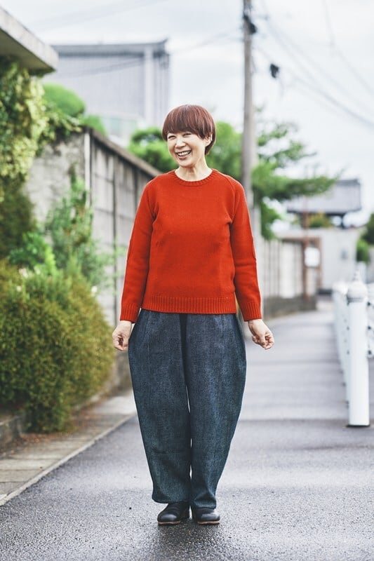 長野市の峯村さんが育てるサフォーク羊の原毛を使用し、糸作り、編立まで日本国内で作るこだわりのニット。※金子さんはサイズSを着用