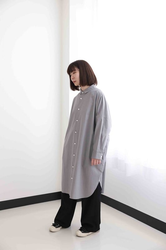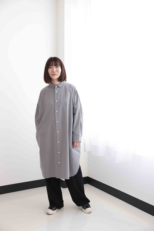 そんな願いを叶えるべく、「ハウス」のこれまでのアーカイブから、たくさんのサンプルシャツを着てみた一田さん。「これがいい!」と選んだのは、身幅がたっぷりとしてストンと落ちるロングシャツでした。その形をもとに「おへそロングシャツ」が完成。