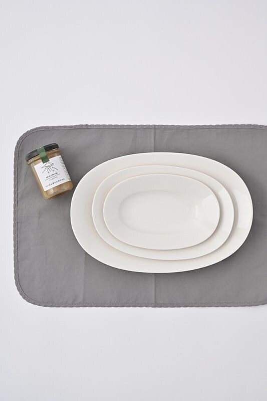 深さがあるので使い勝手がよく、広めのリムが料理を引き立てます。オーバル皿はS、M、Lの3サイズを用途に合わせて組み合わせて使えるのもうれしい。シックで愛らしいグレーのマットに、オーバル皿をセットすると、温かみがありながらも大人な雰囲気に。素敵なカフェに来たような、特別なランチタイムが過ごせそう。