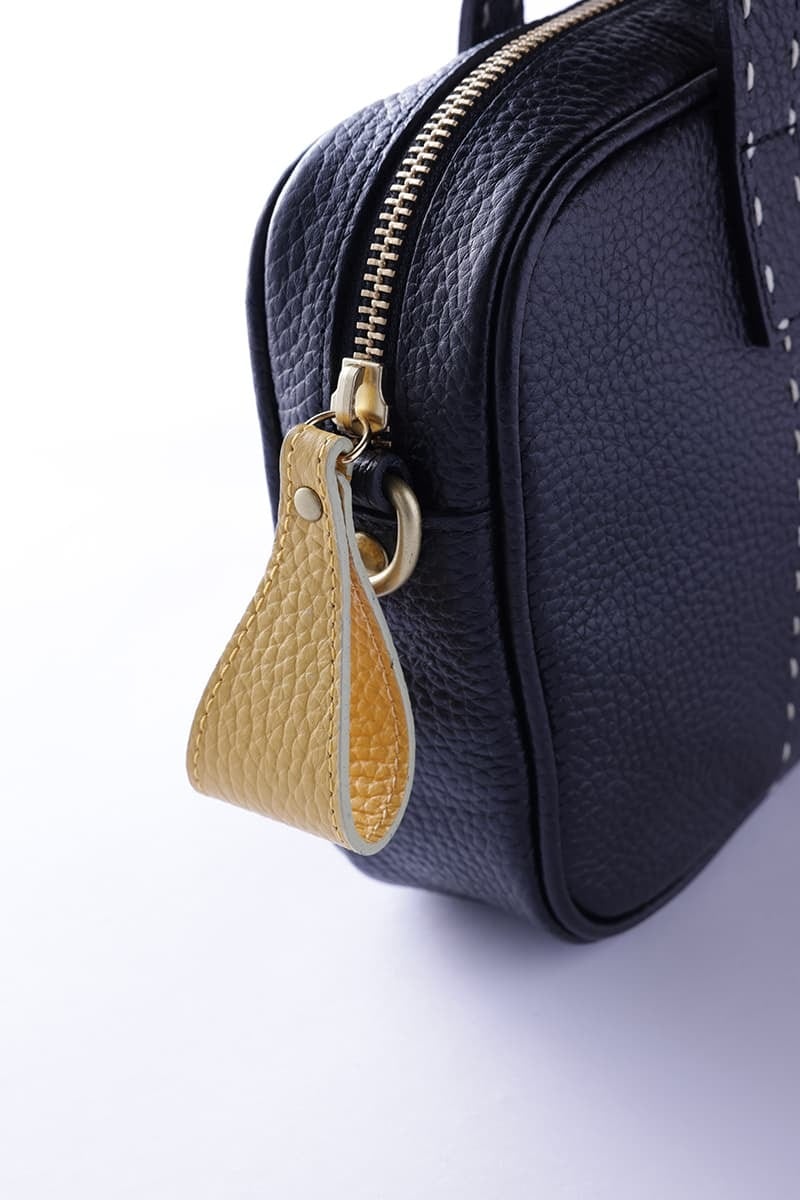 「フォルムはベーシックですが、麻糸でステッチを手縫いしたり、ストラップや外ポケットの配色を変えたりとアクセントをつけています。トラッドにもカジュアルな着こなしにも合わせやすいですよ」とデザイナー・丸山由美子さん。