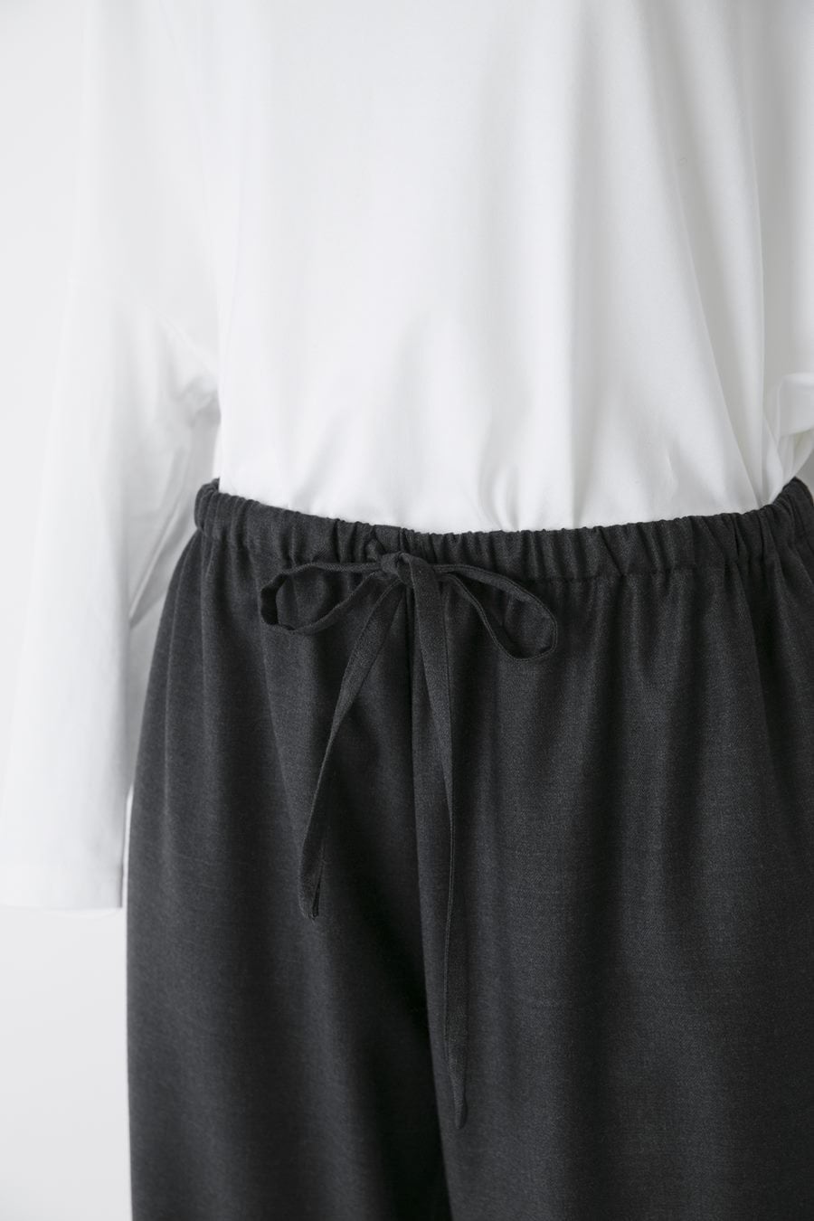 身体にやさしい素材を使い、気分をあげてくれる“毎日着たくなる服”を展開する「ナオコノ」。こちらのパンツは、厚すぎず薄すぎない適度な厚みで、腰や腿周りはゆったりしていながら、足首がしぼられているので、すっきりとはけます。ファインウールにポリエステルをブレンドした生地は、軽く、起毛がきめ細やかで、ラクチンな着心地です。
